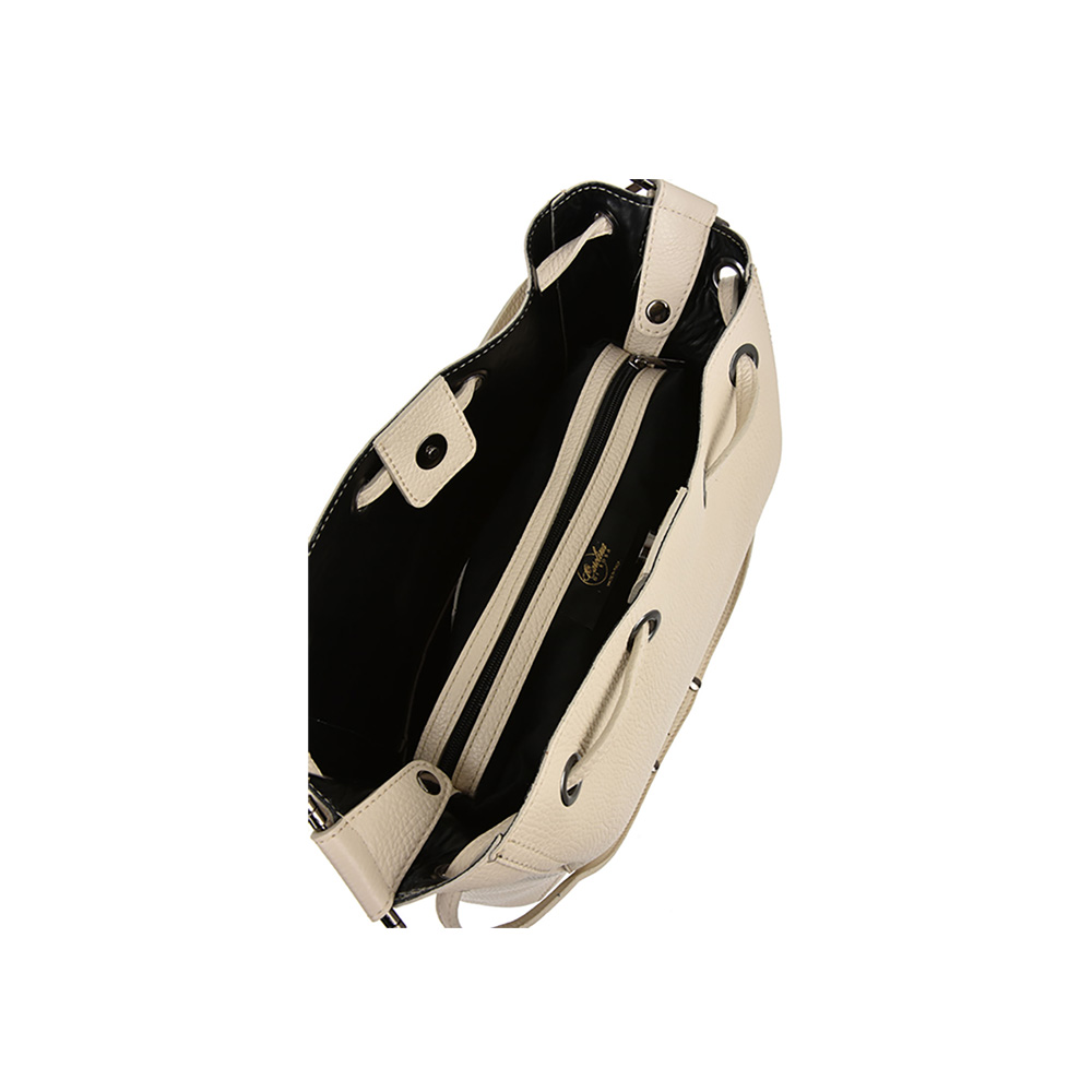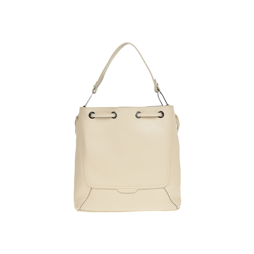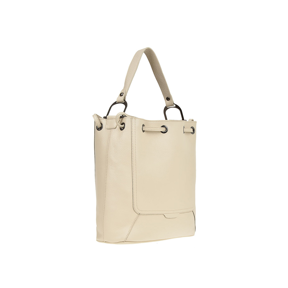 Outer: 100% LeatherSingle top handleMagnetic button and draw strings closureOne removable interior zip wallet with one slip interior pocketTwo shoulder straps: length 90