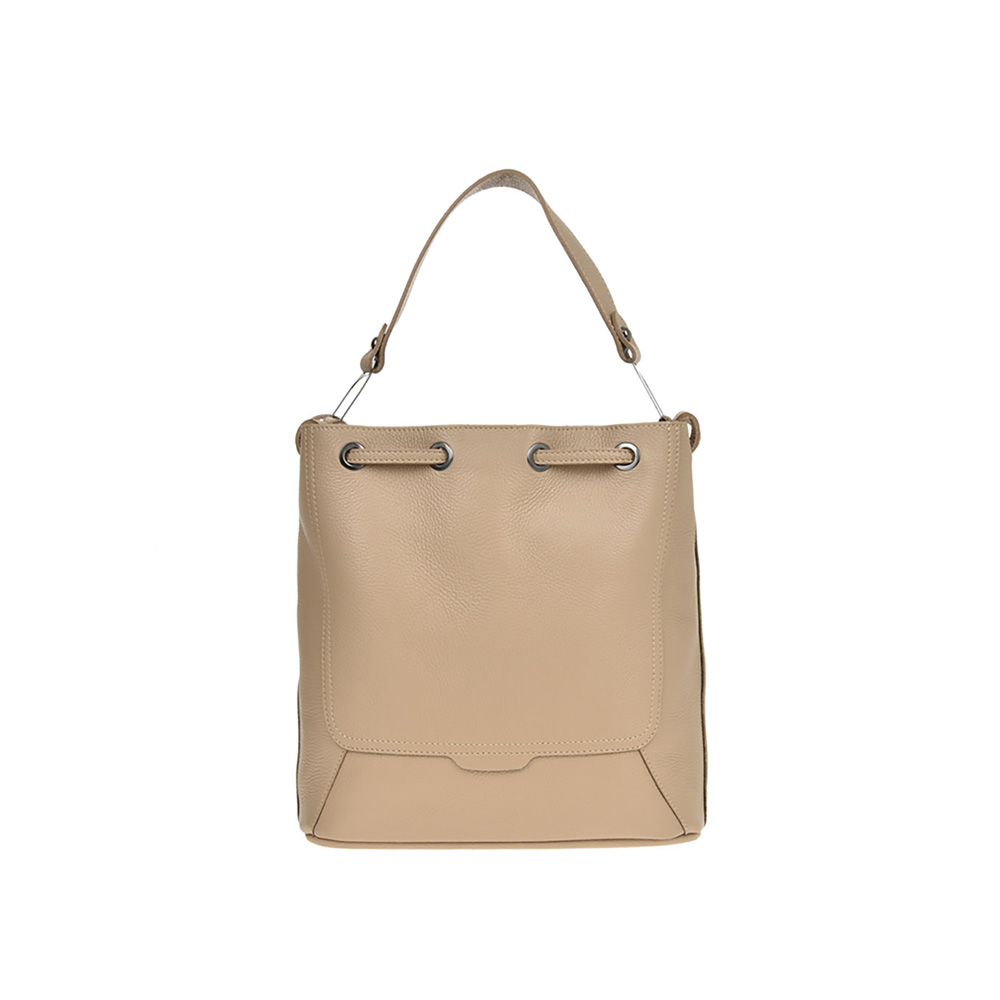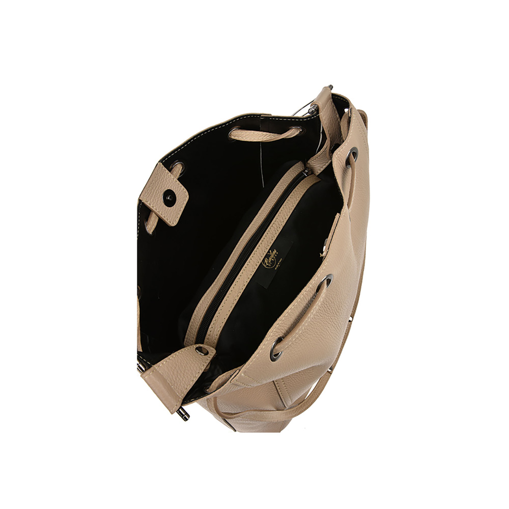 Outer: 100% LeatherSingle top handleMagnetic button and draw strings closureOne removable interior zip wallet with one slip interior pocketTwo shoulder straps: length 90