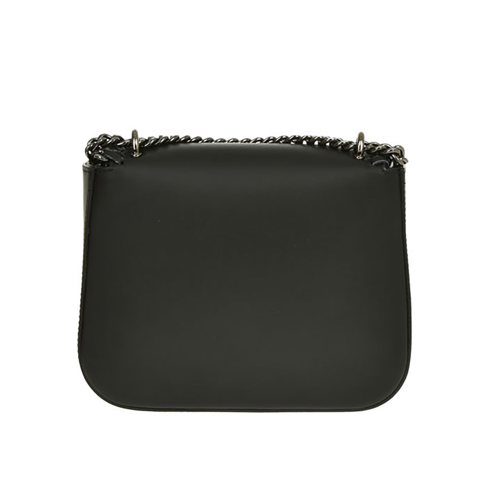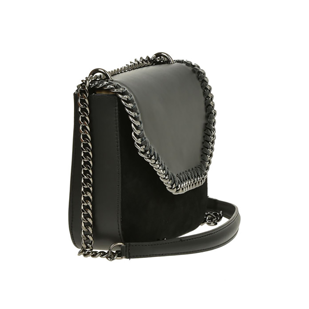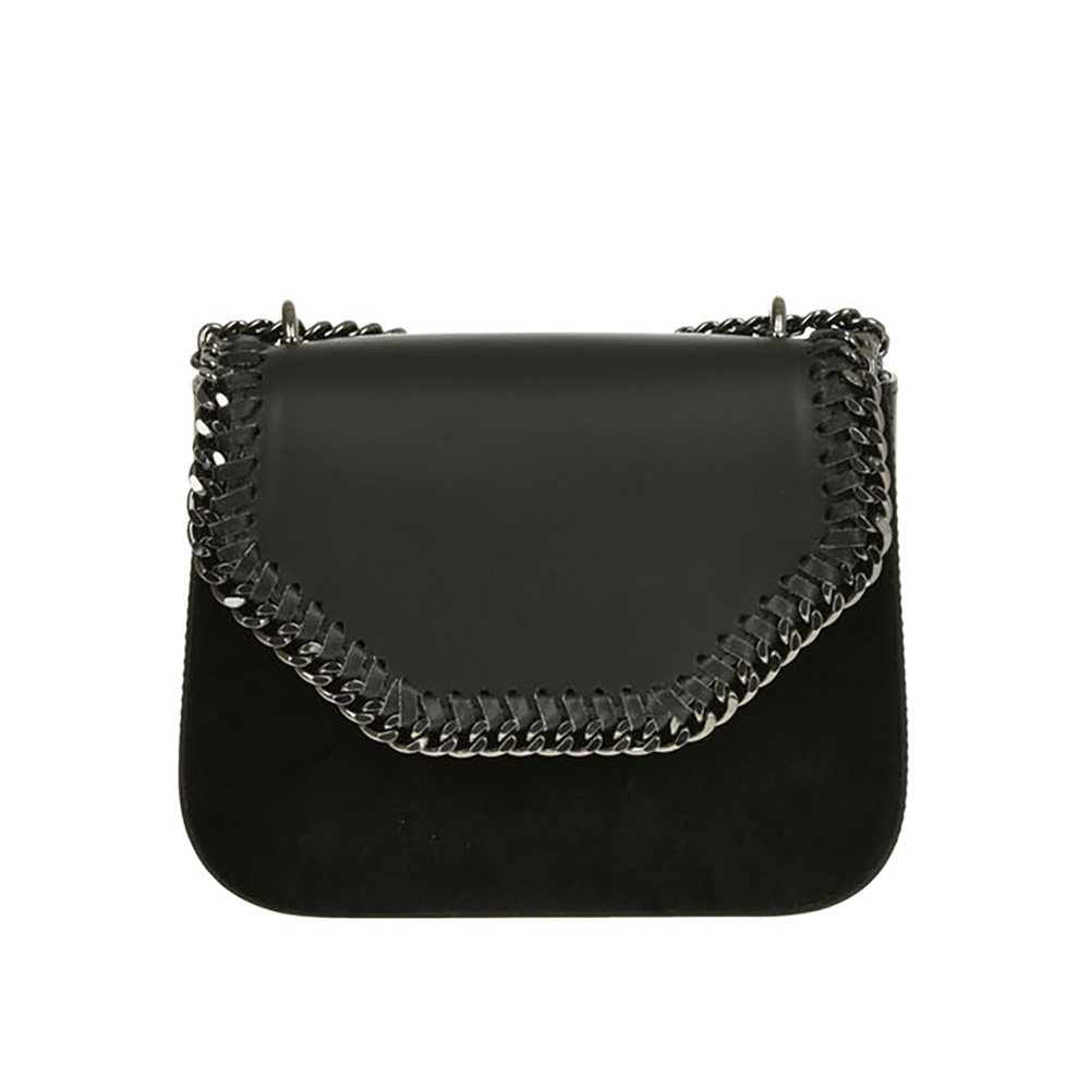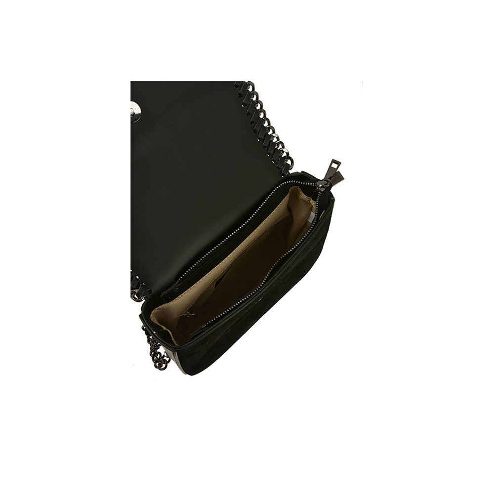 Outer: 100% LeatherTop flap over with magnetic button and zip closureOne zip interior pocketShoulder strap with chain and leather, length 144